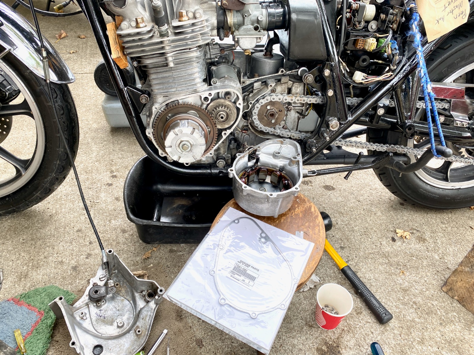 There is a full charge of oil in the engine, so I wanted to do the work with the bike leaned to the right. Which involved leaning her lower right frame tube onto some wood. And just in case she fell over, the big plastic garbage can might cushion the fall. Real "shade tree" stuff!