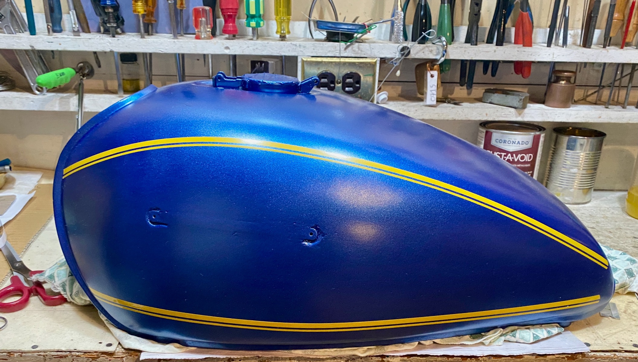 The tank is a big acreage of blue, and needs to be broken with some pin striping (or perhaps flames as my buddy suggested!!).