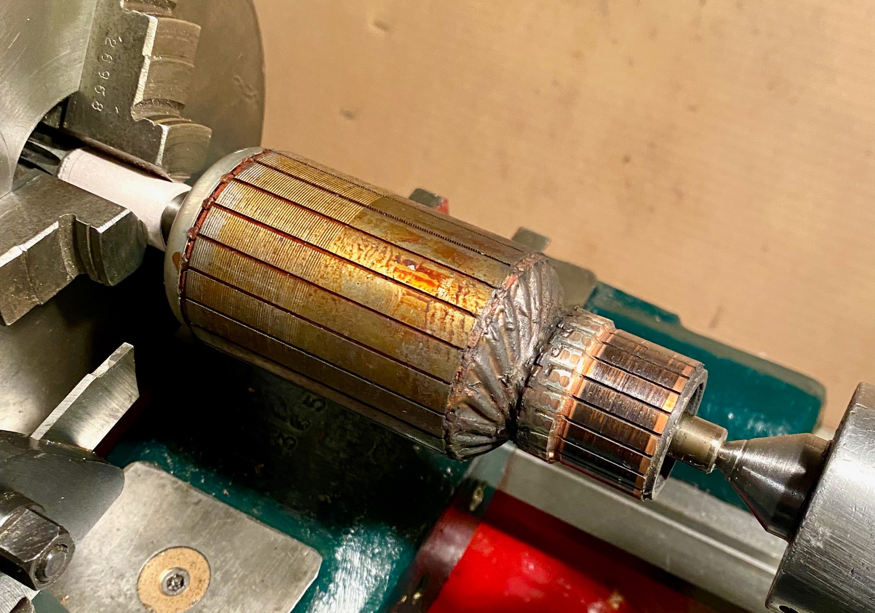 Cleaned up the commutator, and there seems to be a small "wound" on it, but only about a thou deep, which can be seen on the working brush faces (red arrow).