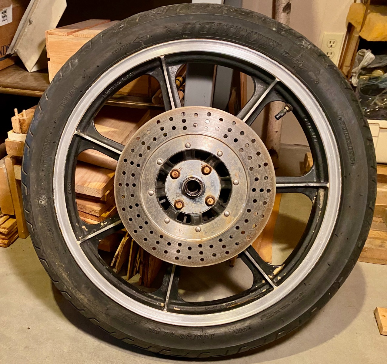 She's rolling a 100/90 19 tubeless, but there's some sidewall light cracking, the tread is legal but minimal, rubber seems hard, and it's not great at holding air.