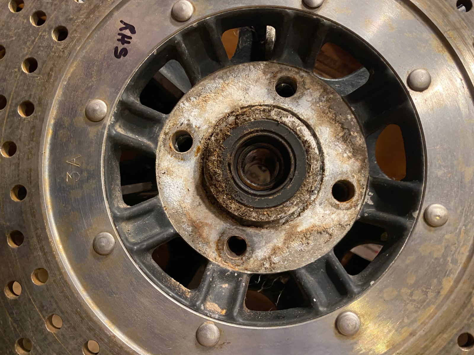The first thing I noticed was those rotor bolts were not very tight, and tightened unevenly. Definitely someone has been in there. All the bolt threads are good.