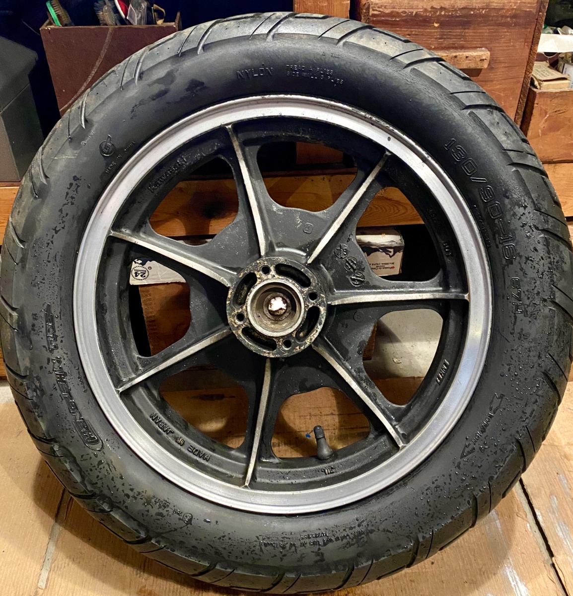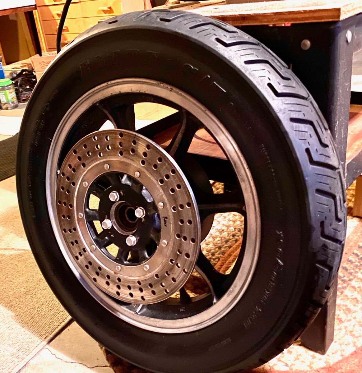 I spun up the wheel, tire, rotor, assembly on the axle and there's not a trace of wobble in the rotor. Good machining from Kawasaki.