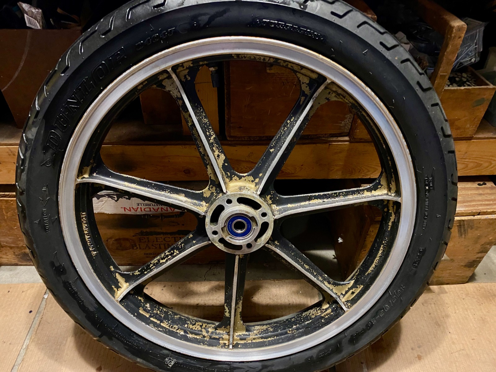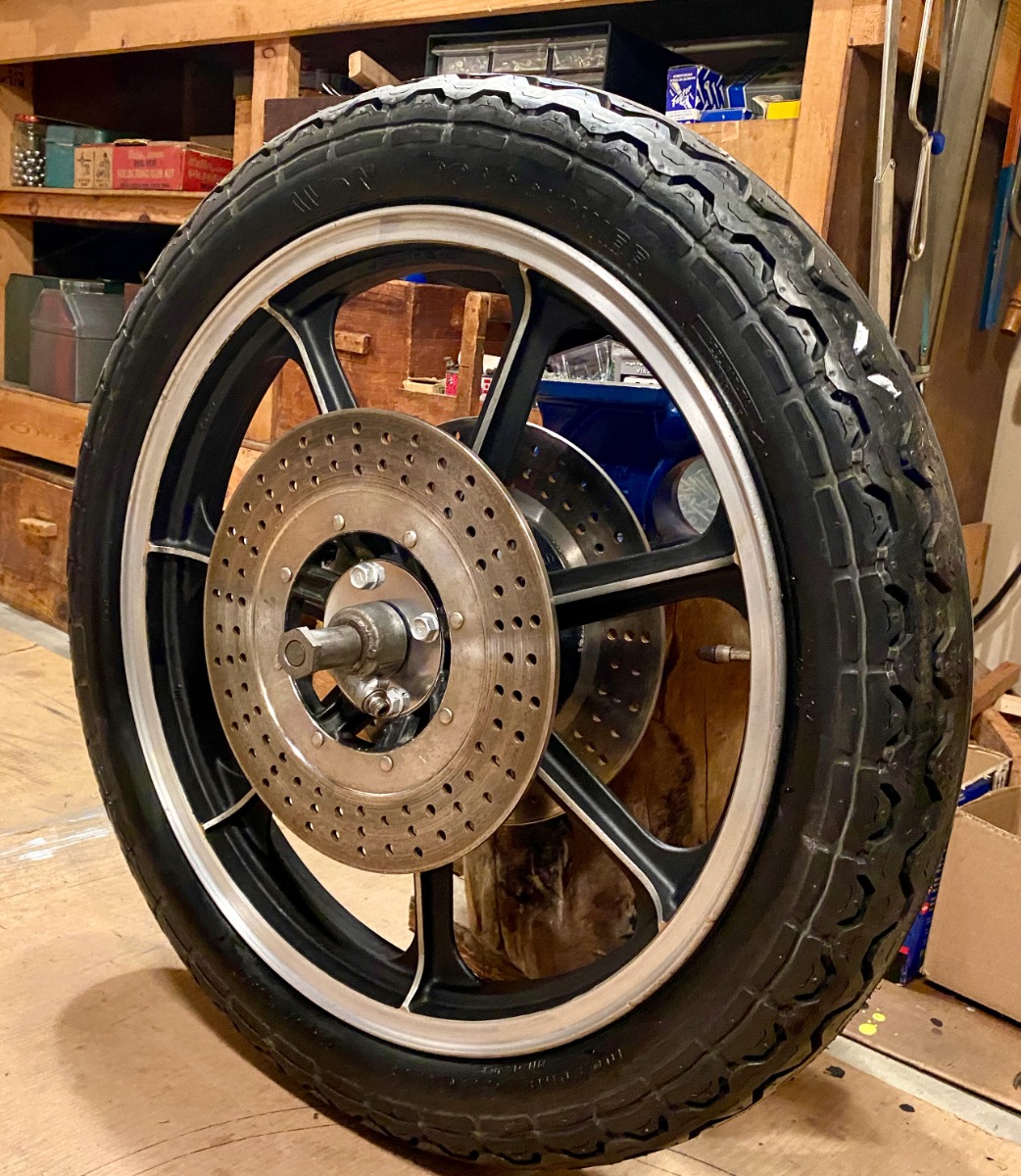 It was interesting to note that when working with the bare cast wheel it was very light, and when the tire, tube, rotors, axle, and speedo drive were added, it morphed into a rather heavy lump. When you add in the fork sliders and brake calipers, there's a lot of unsprung weight.