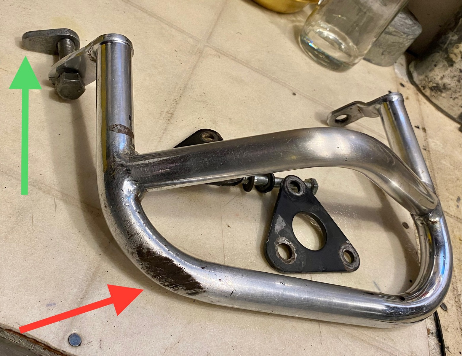 She's had a bit of a skid on the left engine guard, see red arrow. Looks like more than a parking lot tip over, but not a highway slide, but that's a guess of course.