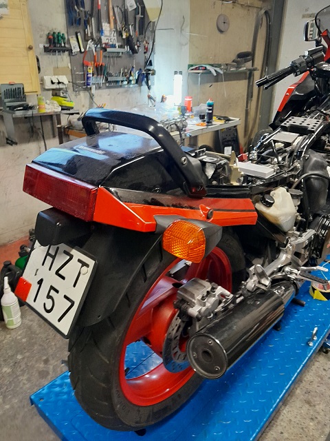 Still no sight of the brown seat, the hacksaw blades, the exhaust bandages, the led blinkers, the steering end mirrors or the Maltese cross rear light, so I just had to continue with the boring stuff.