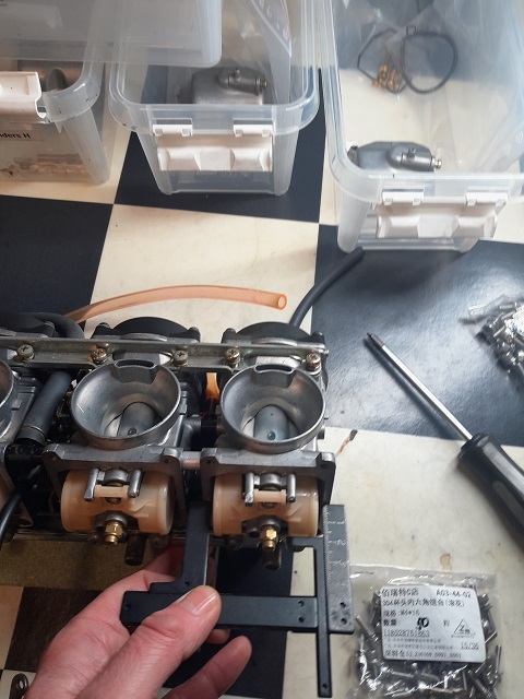 Next up the carbs, with all new o-rings, float needles and that missing throttle needle seat the carbs could go back together. Unfortunately the all new hexcap fasteners that I ordered from China (bags of 50) hadn’t showed up yet as the original JIS m5 screws had been badly mutilated when the PO had removed the bowls with the carbs still on the bike.
