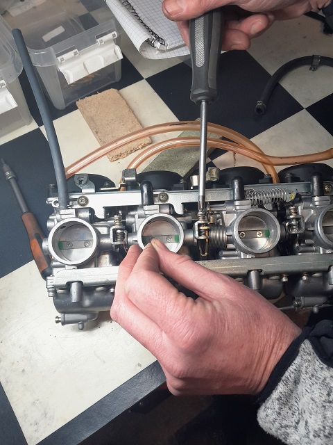 Set the carbs up on the bench and attached the service tank in order to check that it was not overflowing. But it was tight as a duck arse. So drain the bowls in order to get them ready.