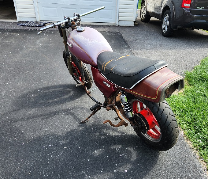 I came across ANOTHER 750 Twin for $300 WITH A CLEAN title in Ohio, and scooped it up last month. The frame had been cut a little and all the tabs for the seat and side covers were removed. Here she is.