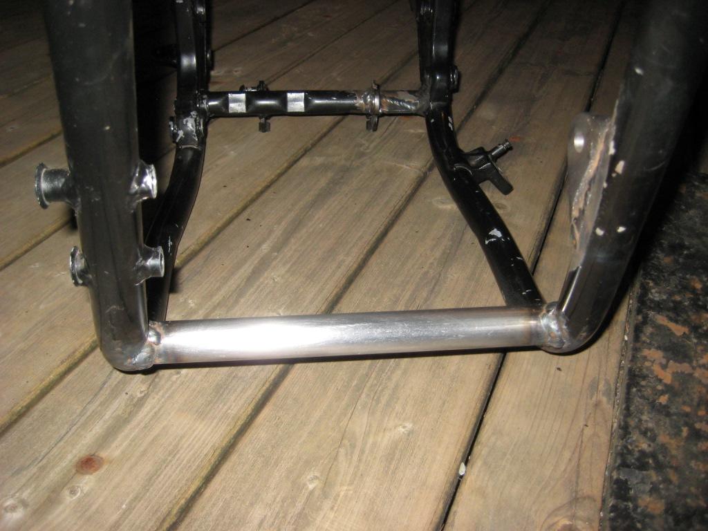There is no bottom front engine mount bolt on the early Z1 motor so you need to weld in a front lower cross tube to gain back some rigidity. The KZ650 frame is pretty rigid stock, if you look at a GPZ750 Turbo frame it is very similar (maybe the tubing has a bigger wall?) The Turbo made about 110HP stock so I am not too worried about any flexing.