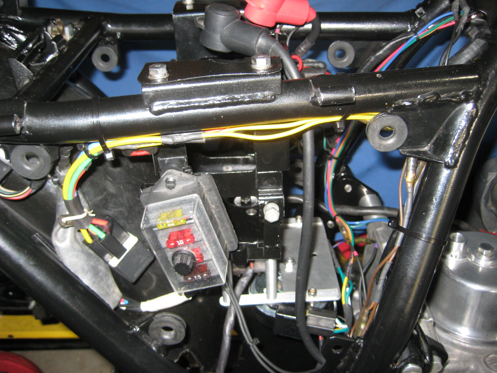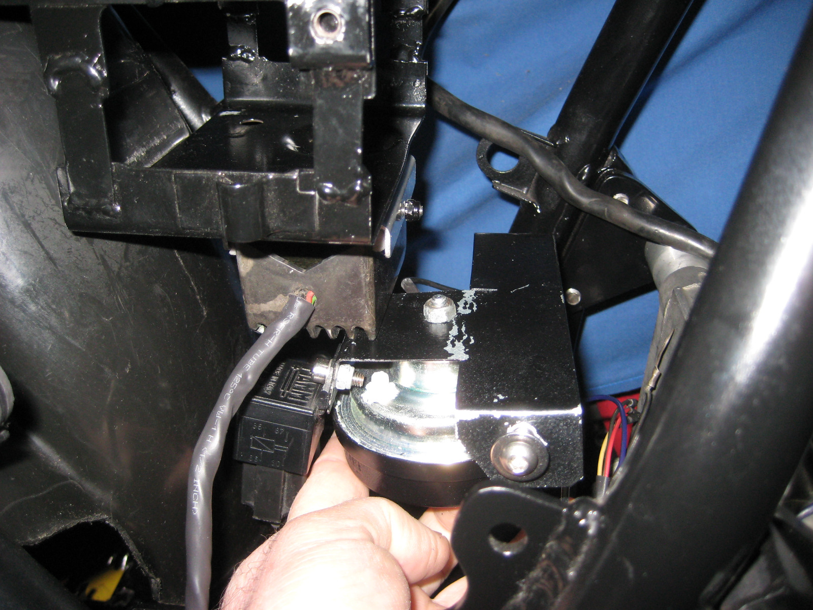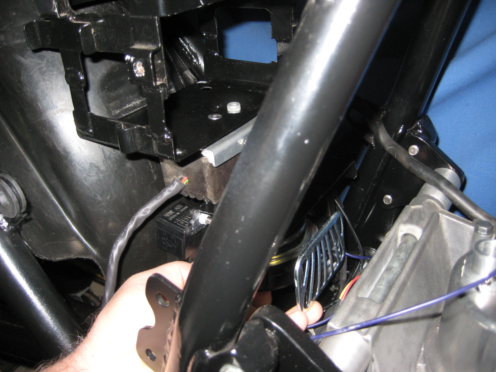 I can also run the power wire thru a fuse in the blade fuse box which I omitted when I had it mounted on the 650. Since the horn is closer to the fuse box I shortened the power wire.