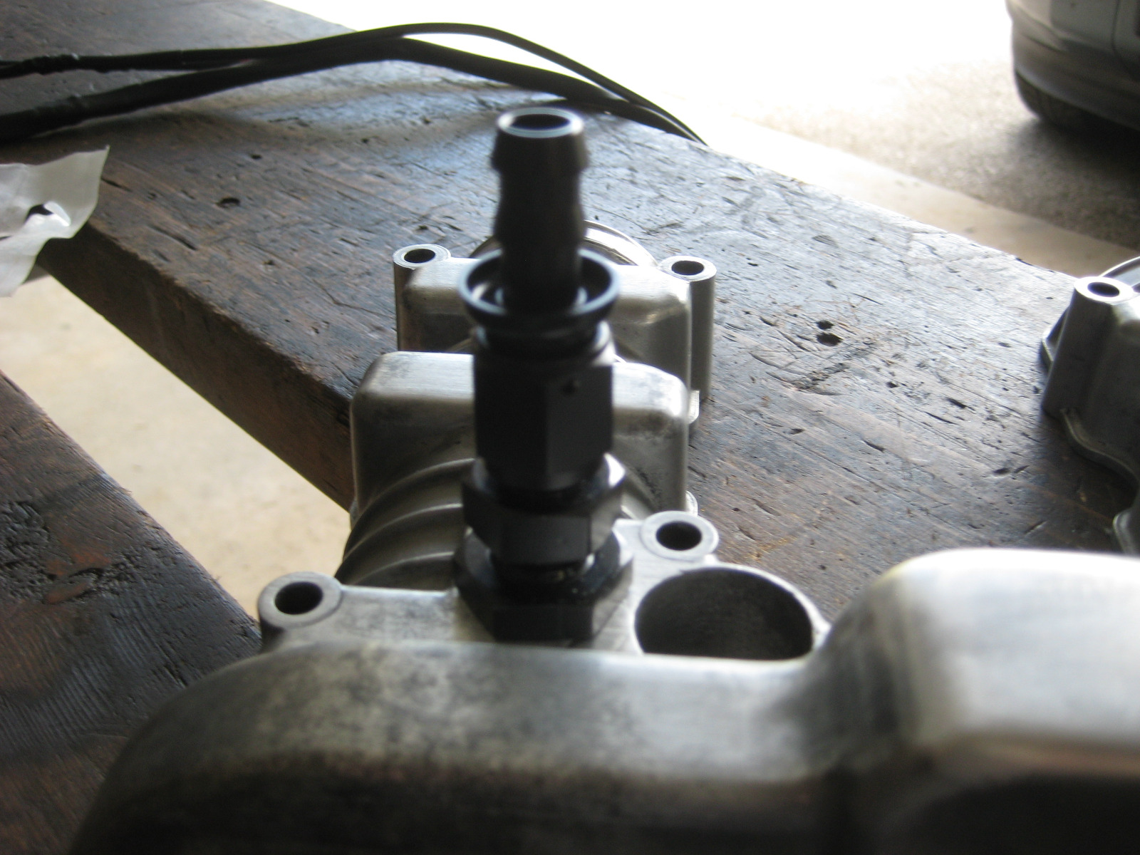 Needed to mock up the cam cover to see if the vent fitting would foul and it did. It is directly under the center of a horizontal frame tube. Had to lower the bulkhead fitting then run a 90 hose end on it.