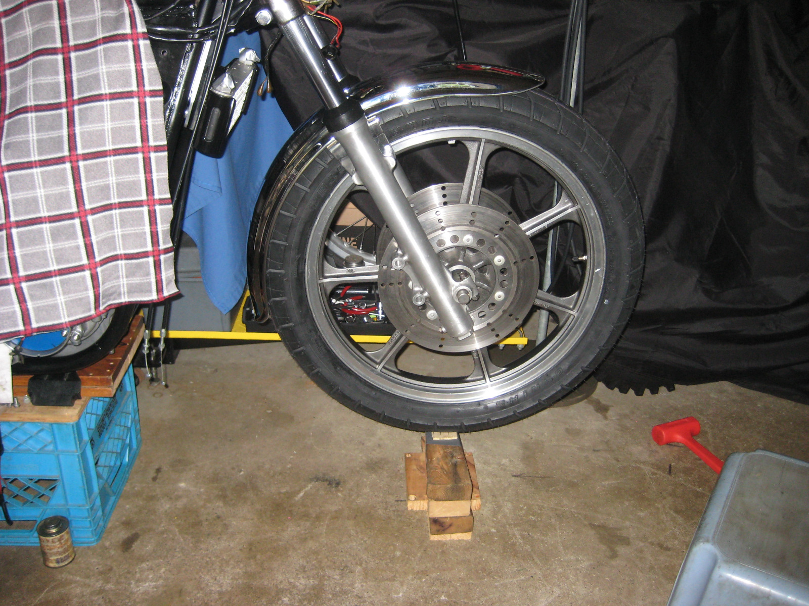 Shitty rainy day here so I decided to get some stuff done. Mounted the front wheel, a bit higher that I thought so blocked it up.