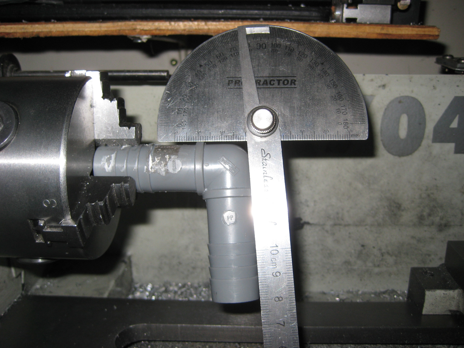 I looked around in my plumbing spares and found a plastic 90 degree AC drain fitting would work if cut down on the lathe. Only issue was the cutting tool could not get close enough so decided to cut it with a aluminum file and some 80 grit paper.
