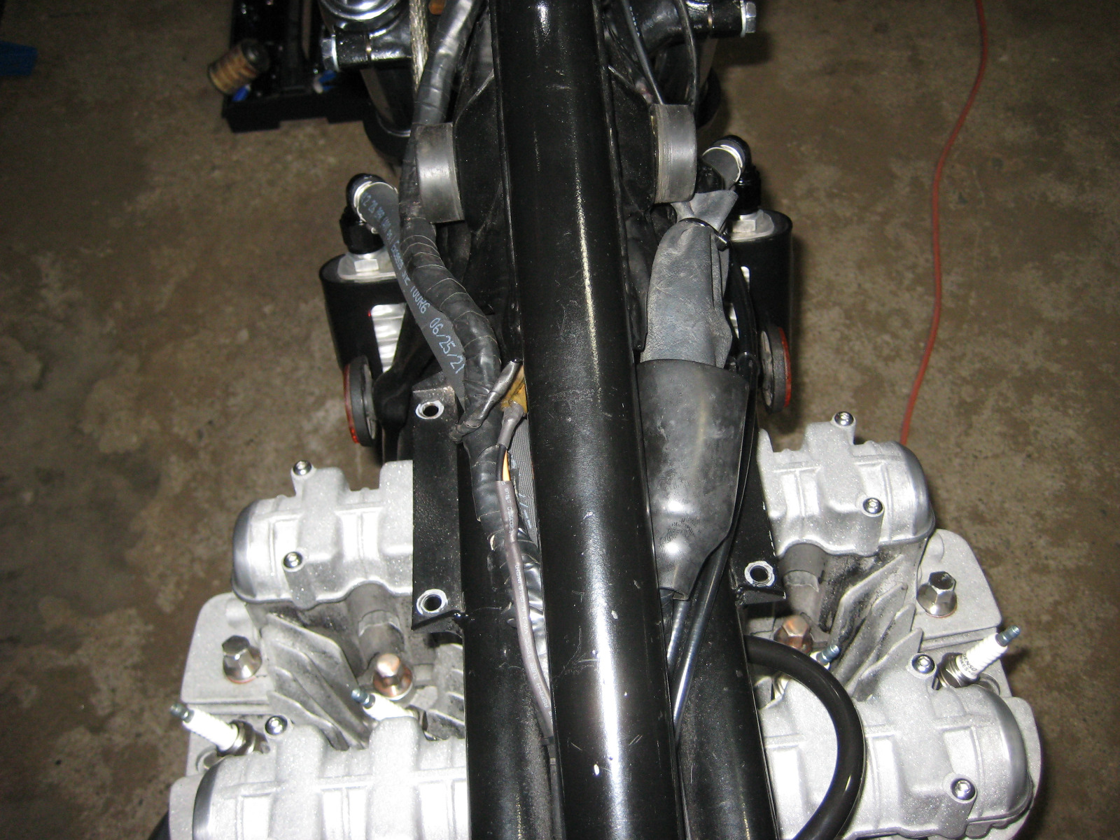 This is where the wire harness needs to be for the tank to sit down. I also needed to relocate the catch can deeper under the steering neck gussets as the lines would not pass thru with it where it was. For the line install I needed to remove it to make it easier to assemble the lines.