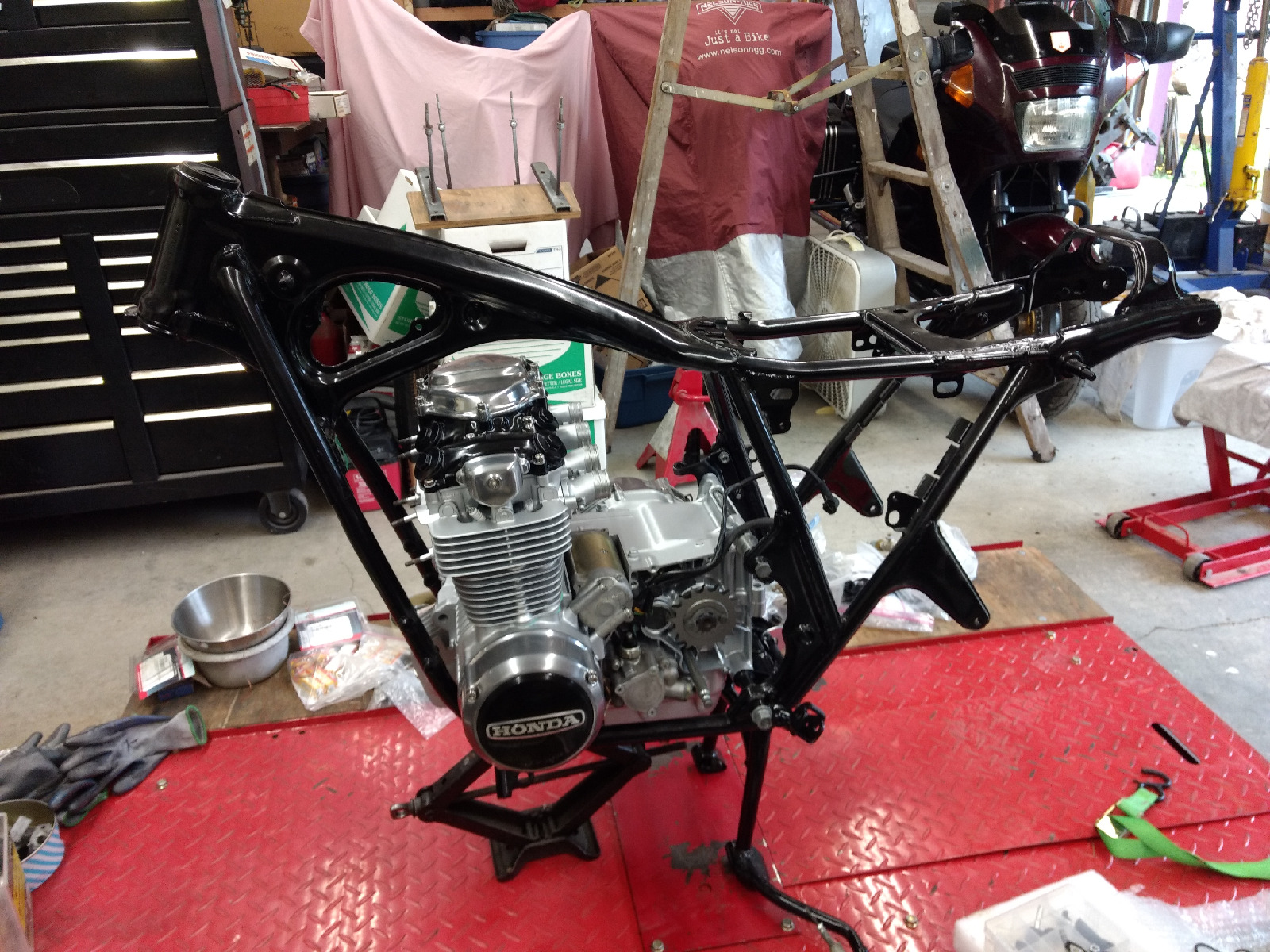 The bike is #449 of the first 500 CB 550 K models when they changed from the 500-4 to the 550-4. I didn't alter the frame to build the bike because of that. Even the seat still uses the original hinges and lock, I did alter the seat pan. We made a few improvements like converting to needle bearings in the swingarm, tapered roller bearings in the steering head, clip-ons with a 70mm rise, custom made rearsets built with all Honda parts, custom seat, Progressive fork springs and Hagon shocks. The goal was to make it look like a cafe bike built in the 70's.