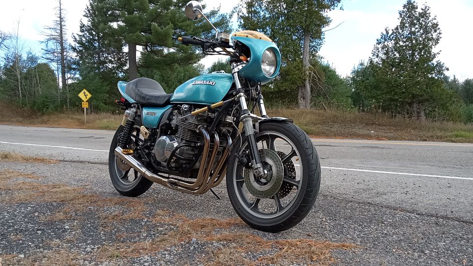 1978 KZ650 C2, 130K kms, Delkevic ex, EI, CVK32, PMC easy clutch, ATK fork brace, steering damper, braced swingarm, ZRX shocks, 18" Z1R front wheel.