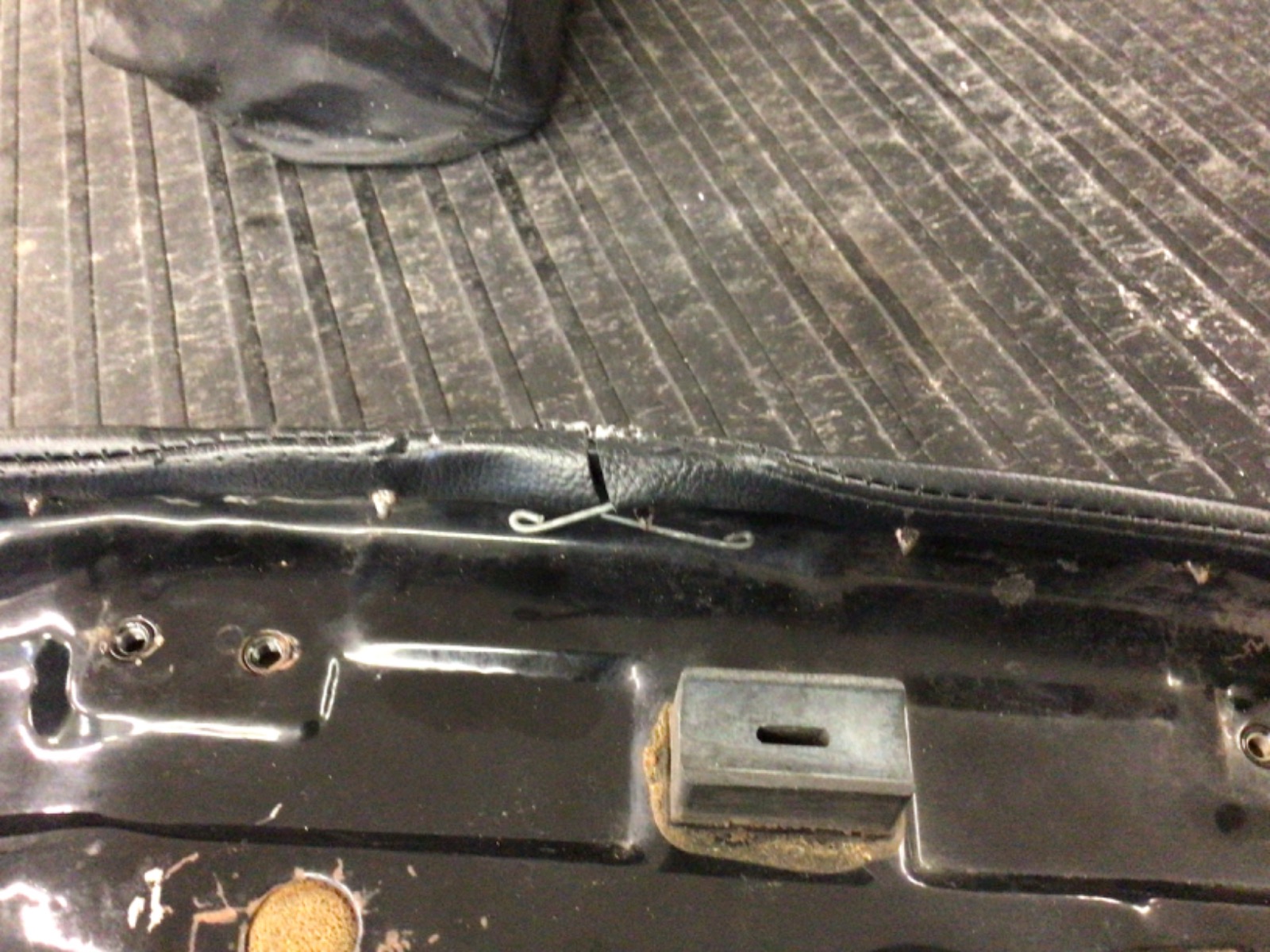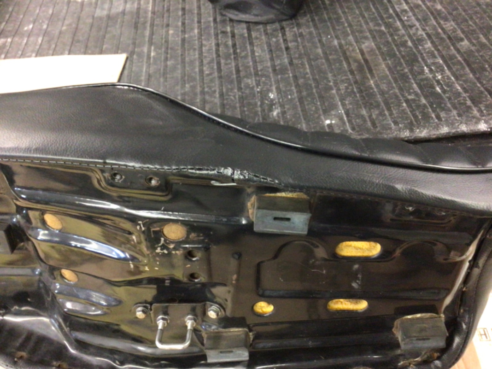 No string. The seat frame itself where the cover wraps around is pretty rounded. Then the cover gets poked through each very sharp metal tabs every couple inches. You can see in this pic the ‘round’ area above those holes. That’s where the wire inside the cover is supposed to be. The only difference between the old cover and the new is that the wire inside the new cover is a little thicker gauge.