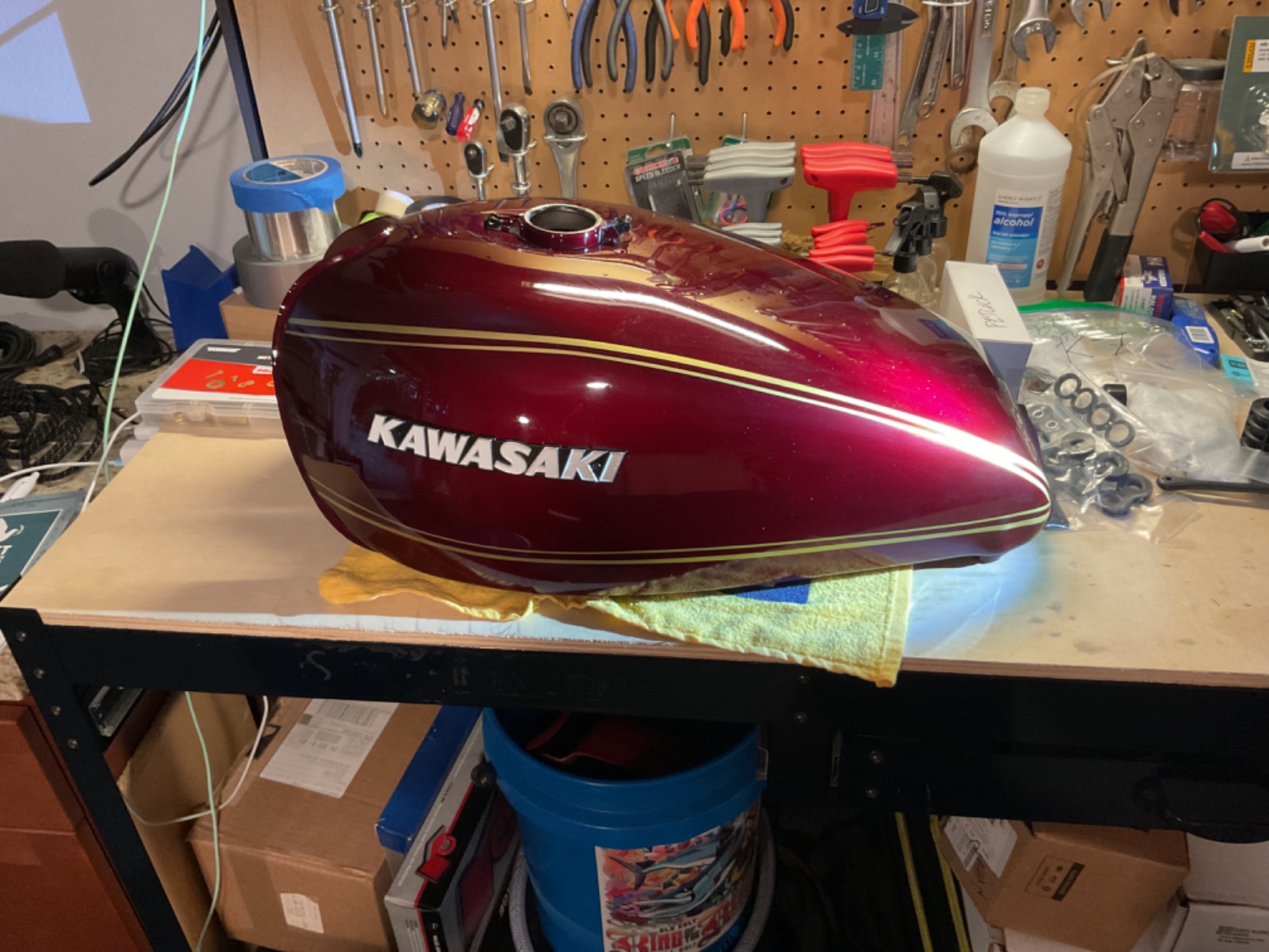 So here is the project,,,,,,I posted all the shit about this bike. Doing it my own way…Heres what i have now….motor pulled at with Joe Hooper at Pitstop performance. Total overhaul of brakes and the painted body kit for Z1 Ent….will need a full wiring job, but bought all the harnesses needed and found a place to wire bike. 34 flat slide mikunis, delkevic header. Pretty much all of this bike will be new parts…cant wait to shred some rubber