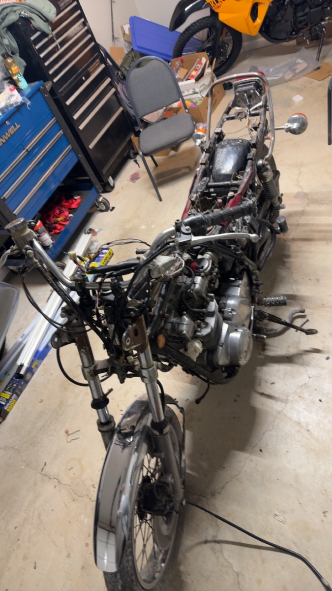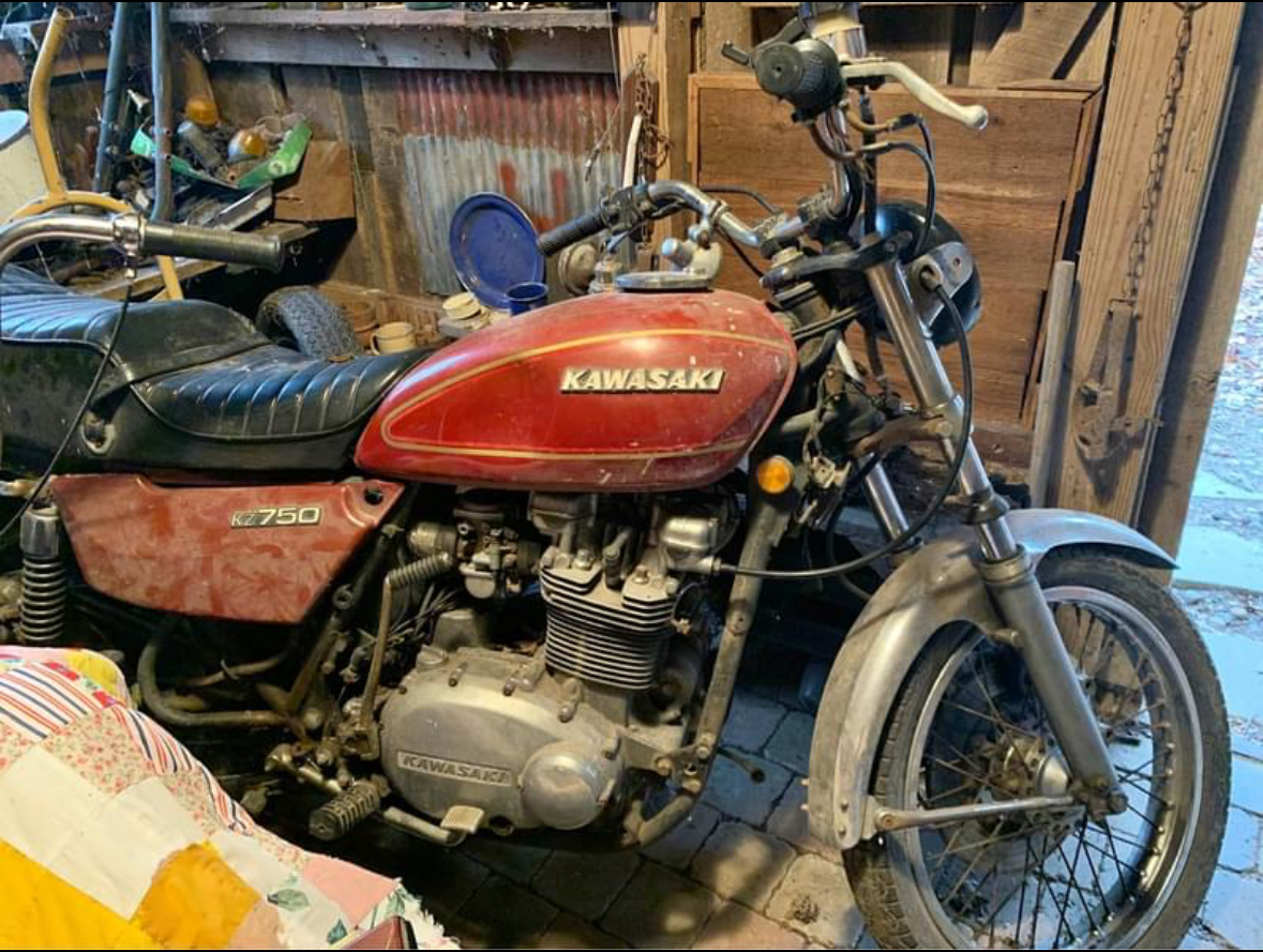 Hello everyone, my name is Peyton and I just bought a 1976 KZ750B for $350.00 as a winter project. I have grown up around motorcycles and have a 2023 KLR 650 and have had a 2007 KLR 650, and various other cruisers, sport bikes, and the like. I have never had a vintage bike and I feel like I have taken on quite a bit. Here is the picture that I received from the seller, a picture with the motorcycle on the trailer, and now disassembled in my garage: