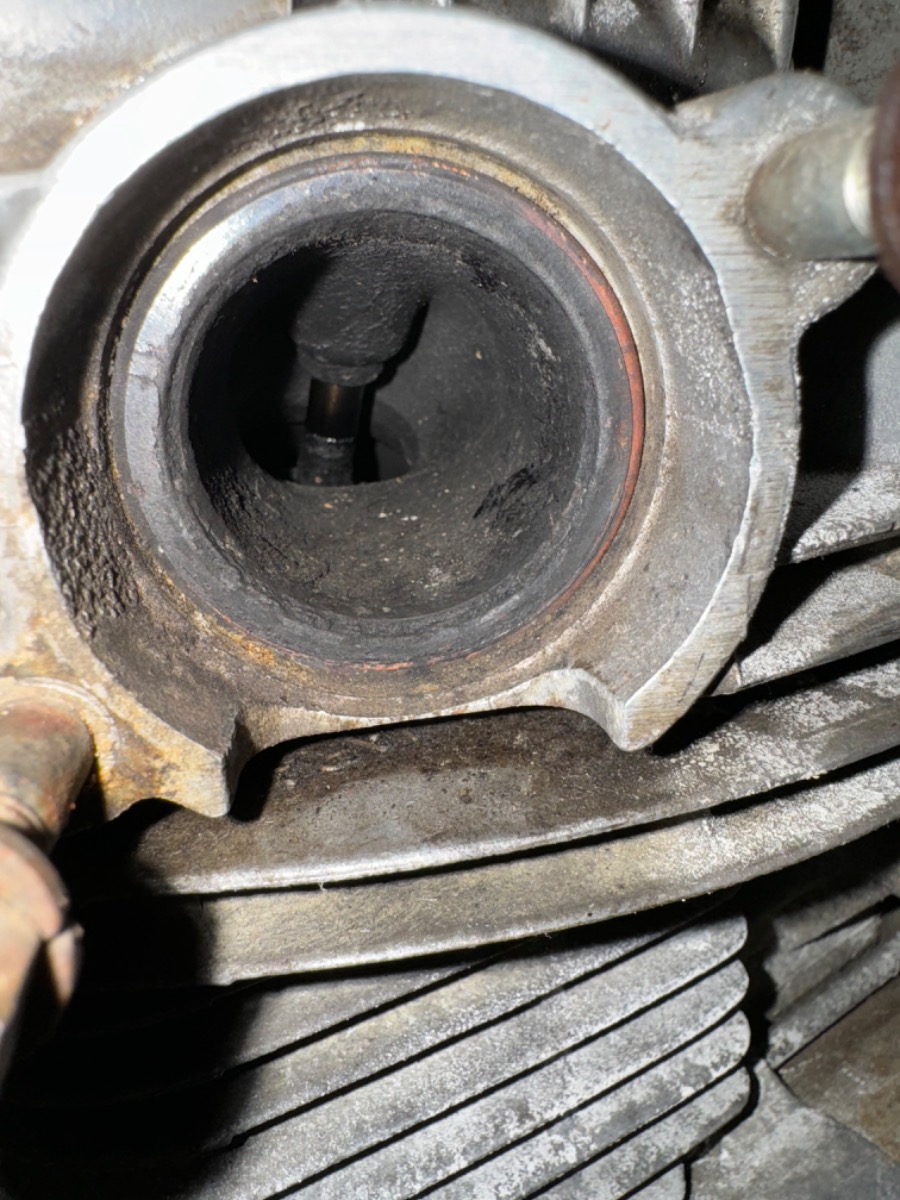 Is the left exhaust port oily? hard to tell in the picture. what the spark plug look like from that cylinder? you can see how these twins like to stop with an exhaust valve open.