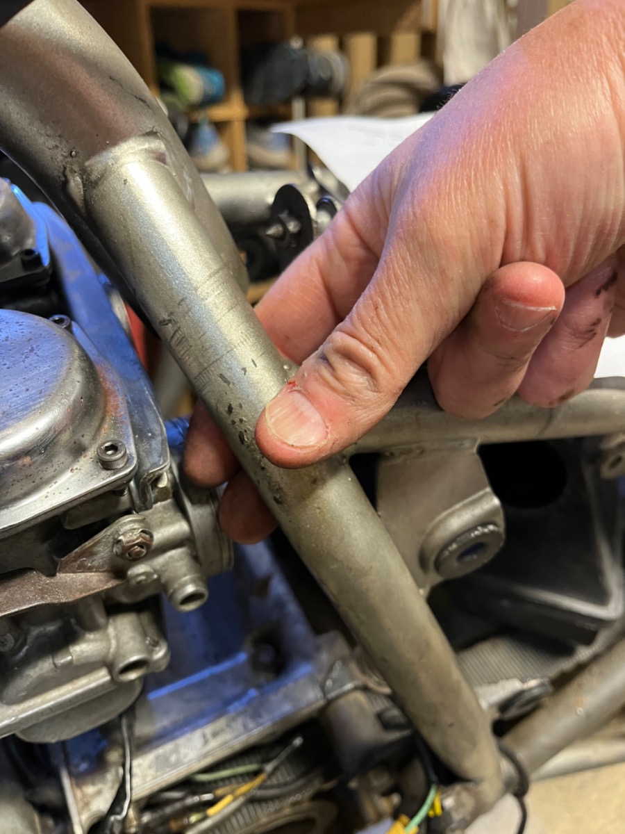 The welded bolt appears solid for the moment despite the crack in the weld. I feel my options are to leave it alone as suggested above, or snap it off and try to install a Heli Coil or better yet a Time-Sert so a new 6mm stud can be installed.
