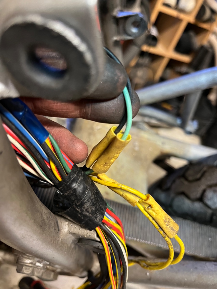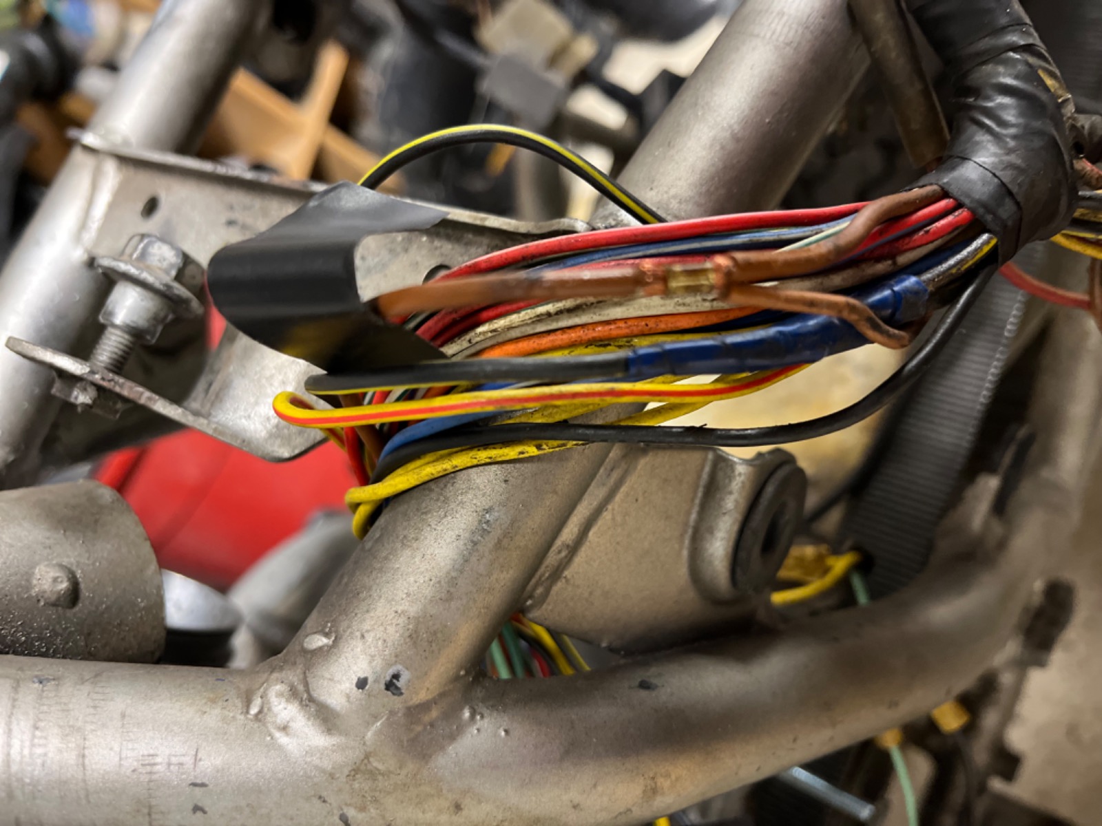 The alternator, neutral and oil light lines have all been cut and badly spliced. Once unraveling the mess and removing the plastic corrugated POS tubing the layout makes sense.