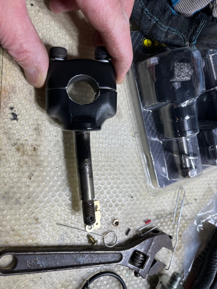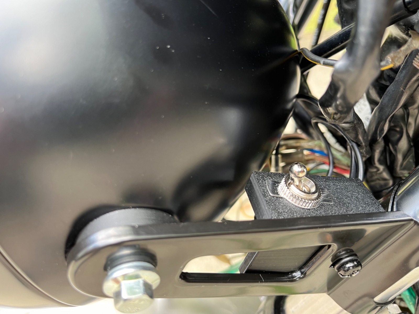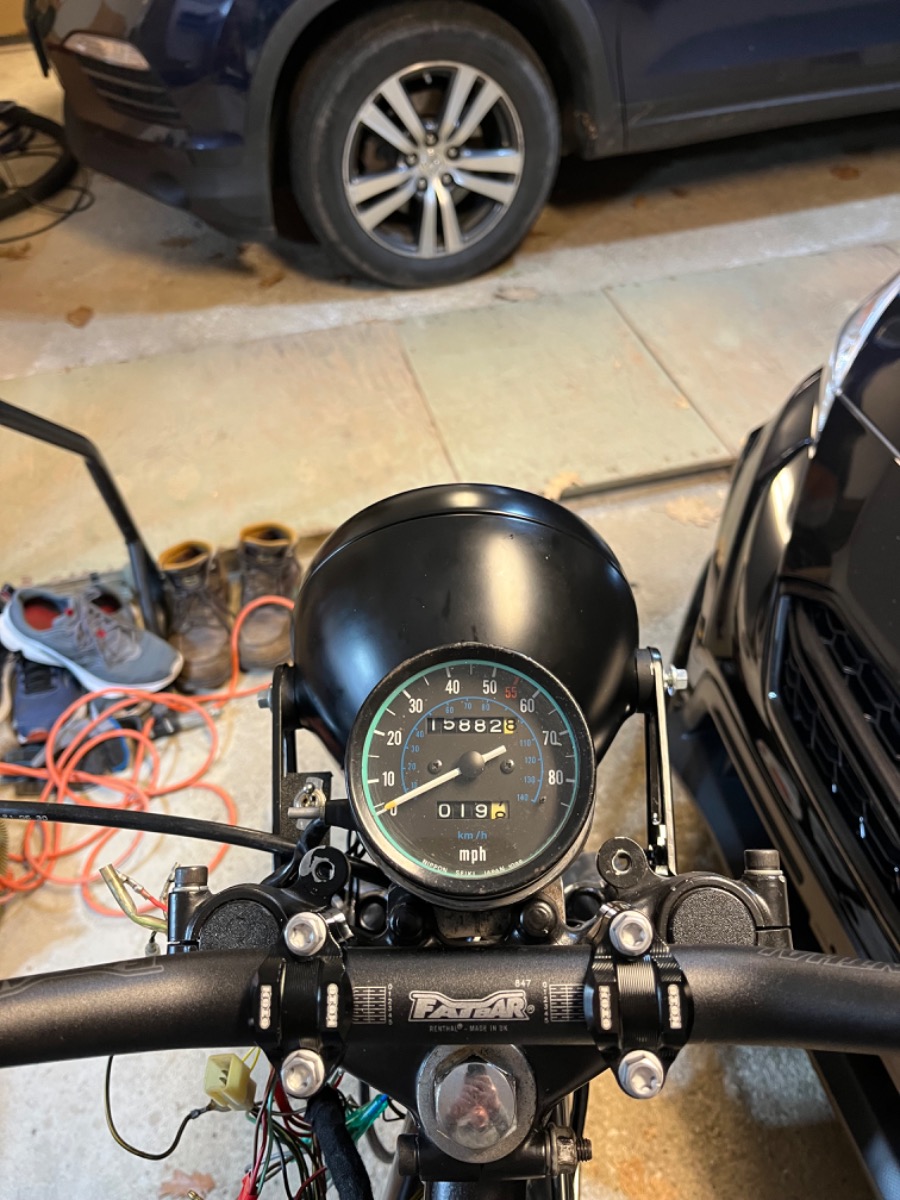 I hope to get a more thorough test in next week after getting my plates and having my neighbor follow along as an extra set of eyes and ears. Assuming that goes well I can start thinking about next steps. The fenders are not in great shape so I most likely will repaint them, and the tank needs stripped and painted as well. There is only one small ding at the very front. The wiring needs to be tucked up under the tank, and maybe get a replacement ignition switch. I like the mini toggle, but not very secure. Also, the old switch gear is pretty beat up and very chunky. I might try something aftermarket that is not too pricey. I also have a few cosmetics pieces found on EBay to repair the PO hacking up the gauge mounts. (no idea what he was thinking…)