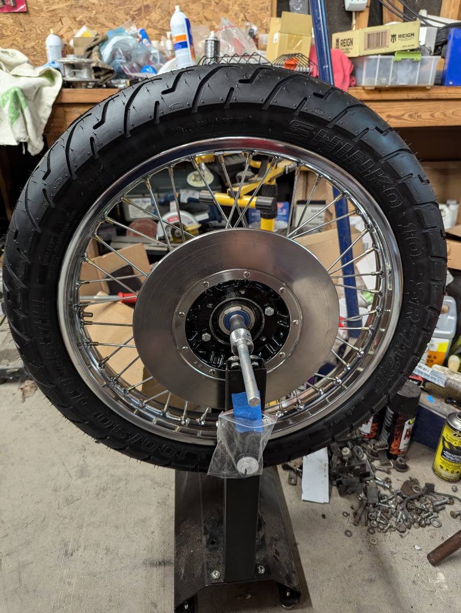 Finally a little more progress. Forks done, front and rear wheels built. Top end on the engine finished and now got the engine in the frame. Disregard those nasty side covers on the engine. They were just old spares I put on in case I scratched something.