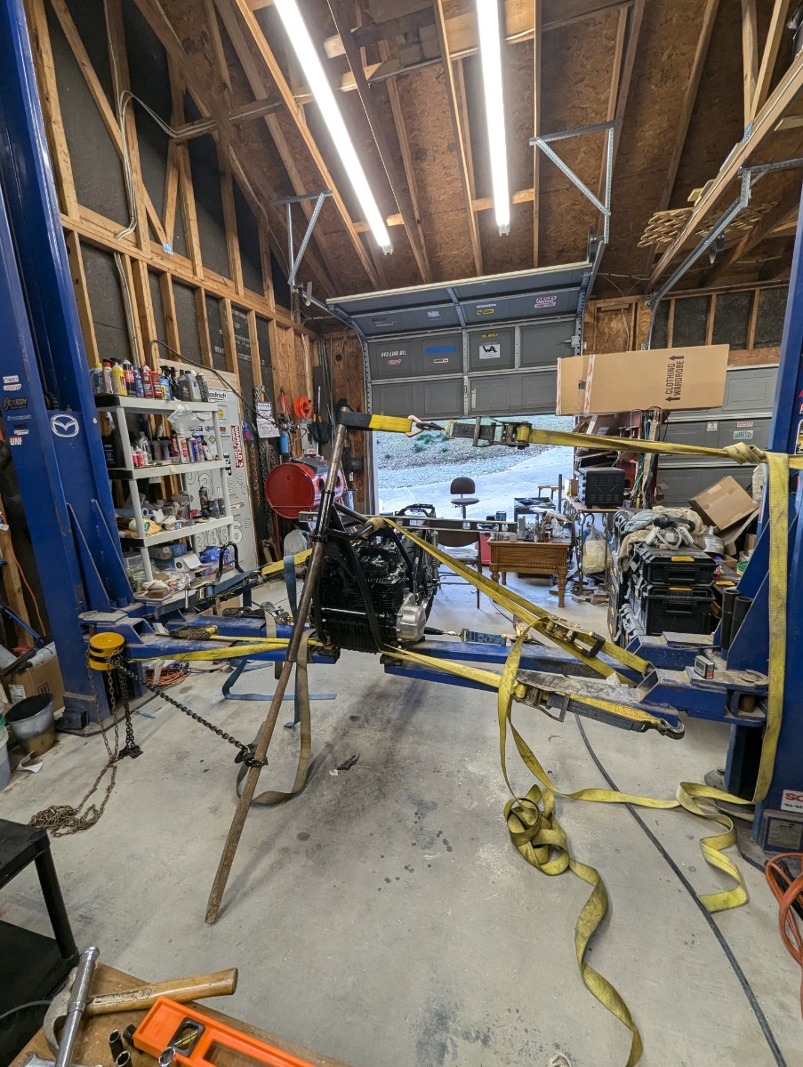 Finally back to work on the 73, I had another project present itself when I got stuck on untwisting the frame. Here's a before and after of the interim project and a picture of my frame straighting apparatus. I welcome any opinions of how to rearrange or modify the current setup. I have it under tension in the picture, and with tension, the frame is straight. I know I need to pull further to allow for snapback when tension is removed. Getting nervous:)