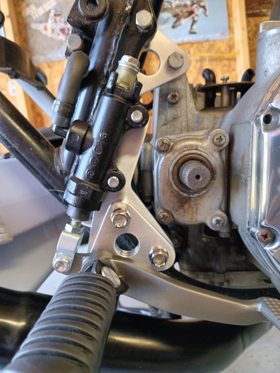 19 Sep 2024 13:54Went to work on the Kawi this last week. Bought some 2008 ZZR600 footpegs and levers and fabled my own brackets. I'm going to get some real spacers, they're just temp for fitting purposes. The master cylinder is a 2023 ZX6. Matches the ZX6 rear caliper.