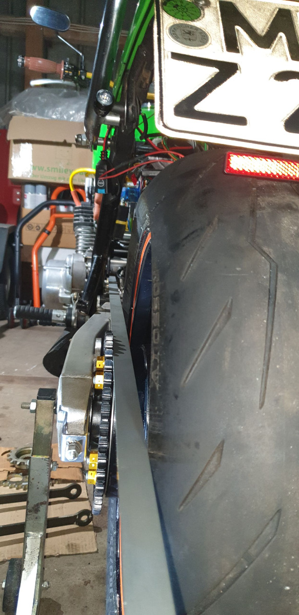 Is your wheel centerd to the frame/swing arm? What size is the off set front sprockt on the out put shaft?