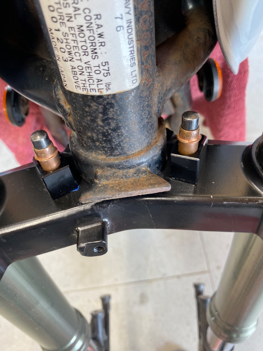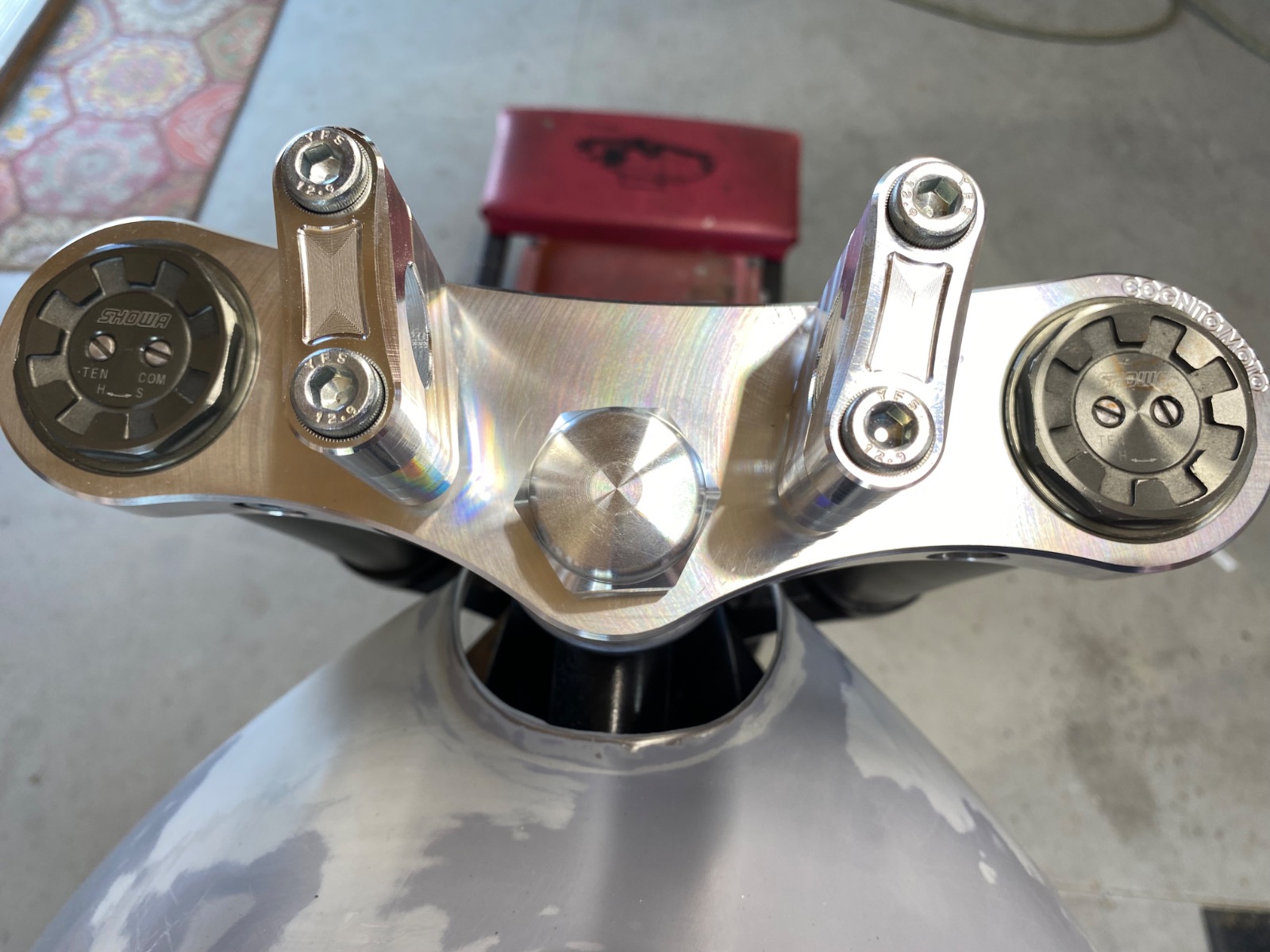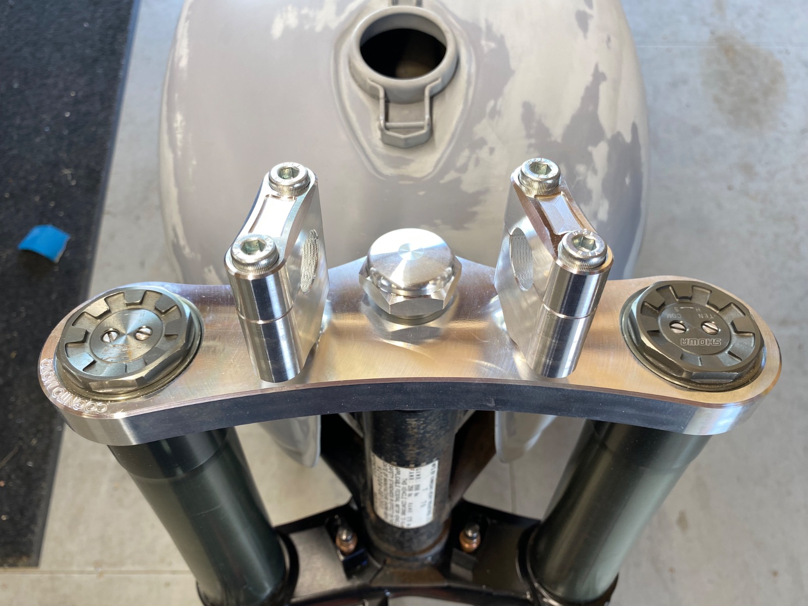 =19.5pxHey all. Been away from the shed for a while but I did get new triple clamps and steering stops from Cognito moto. Fit and look great. Have to final drill and tap the holes for the stops. Next I’m going to get an offset c/s sprocket and get the rear carrier machined for chain alignment. We’ll see how that goes.