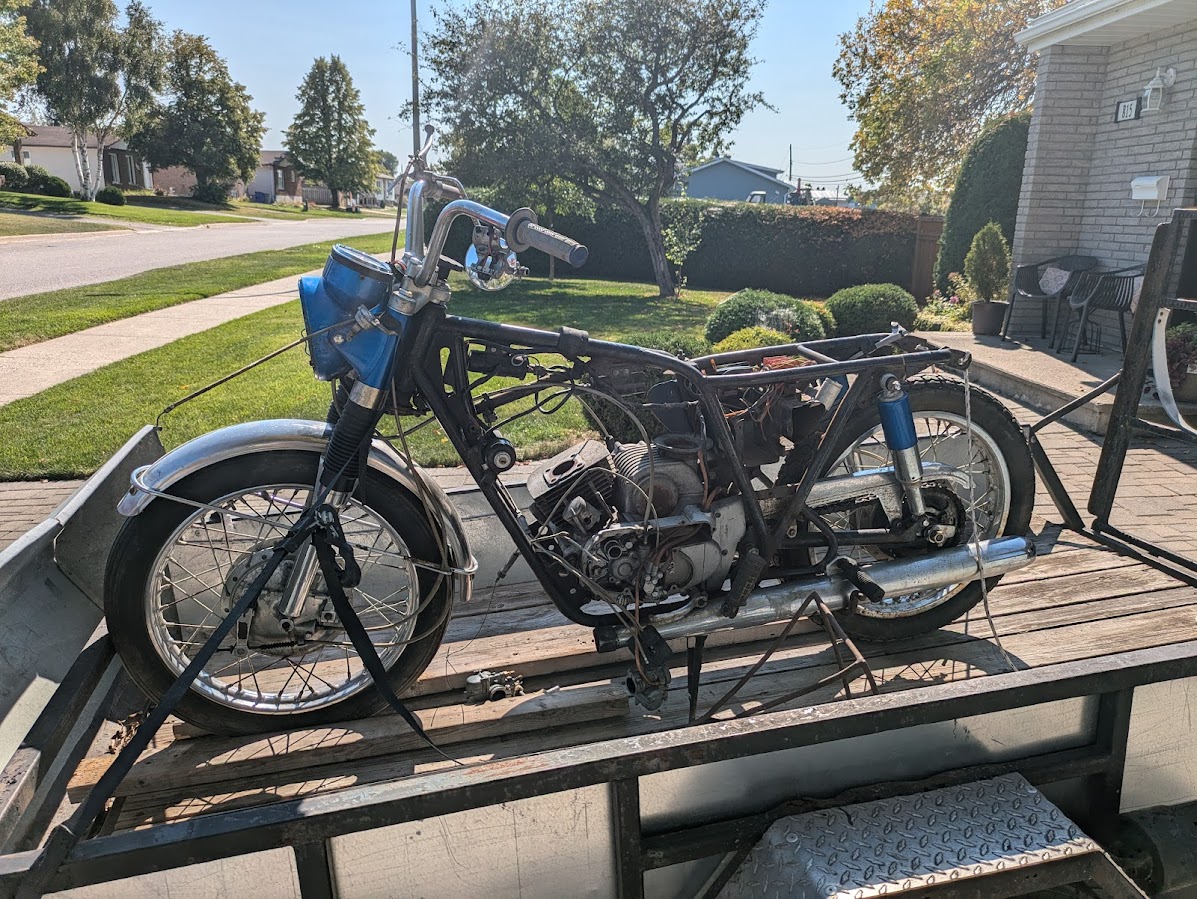No, title, fuel tank, side cover, rear fender, engine covers, header exhaust tubes and nuts, gear shifter, kick starter, headlamp, cables shot, cylinders pistons and heads, engine bolts and screws, only one seized cylinder, some carb parts, one cracked engine case cover, missing electrical parts, no key and no title. Much more but you get the idea. Can I make it work?