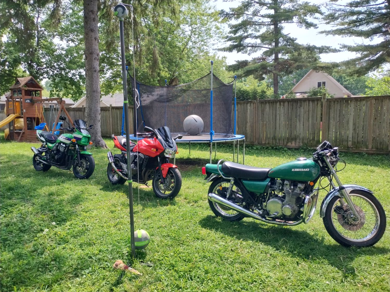 1978 KZ650 C2, 130K kms, Delkevic ex, EI, CVK32, PMC easy clutch, ATK fork brace, steering damper, braced swingarm, ZRX shocks, 18" Z1R front wheel.