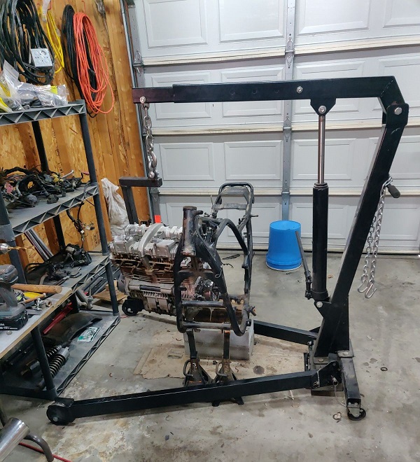 I modified my engine lift adapter for KZ1000 carb boot hole spacing and finished the rest of the teardown. Carb boots came off without too much hassle with the help of a heat gun and a few applications of silicone rubber restoration spray.