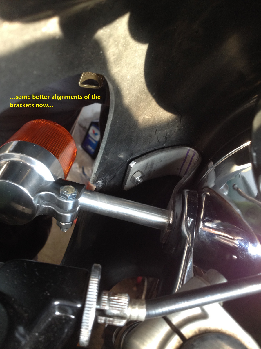 Today´s sunny, but about 0°C, also in the garages,..but i´ve done some little corrections on fairing alignment, by bending the brackets a little more , shorten the indicator studs, and measure out what i will need for the upper supporting studs,...now it´s close enough for me with the fitment about, i can live withit