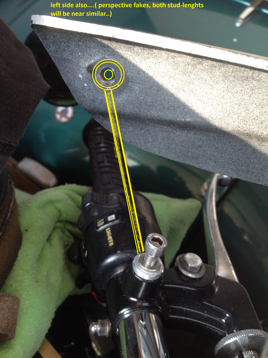 I had to cut out a little on both side of the fairing, to fit around the flascher studs,...and i use the "only-round made myself studs", with M10 threads throught the headlight / holders and brackets...