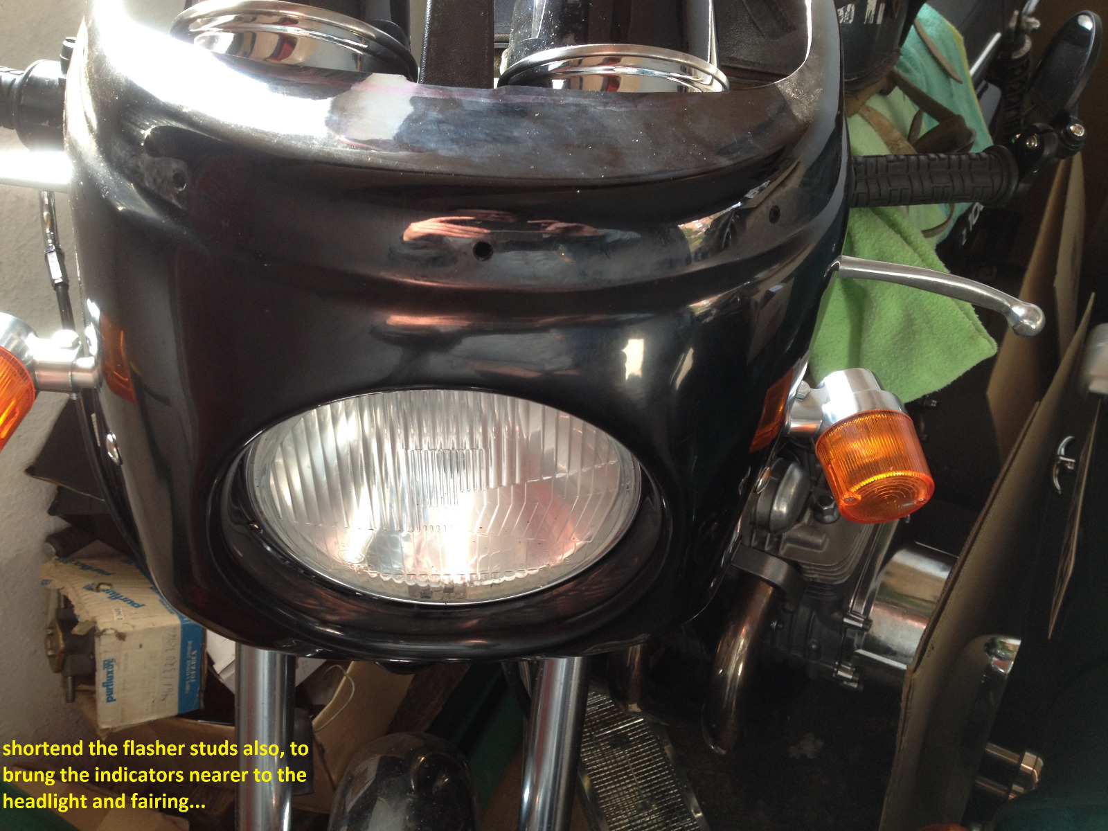I´ve made my blinker studs from Ø 15 mm aluminum, reduced the diameter to 13,98mm to match the Honda blinkers,..the first ones (without the fairing), haven´t been to short with their 50mm outside, now they are 90mm long ( from headlight mounting point), and that a little to long, i think, i will short them about 20 mm each. for a better look.