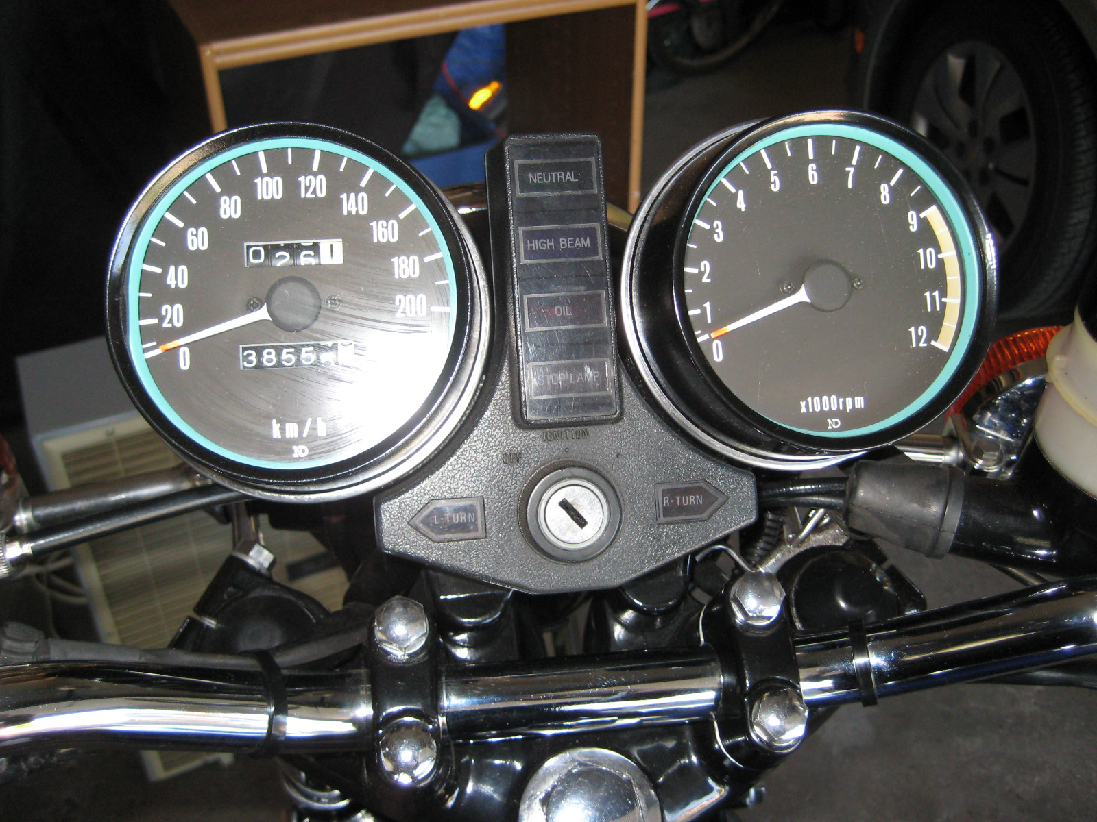 Here is a picture of the gauges on my bike (KZ650) the same gauges that are on KZ900. You can see here those "cross" rod would probably clear the gauges but foul on the master cylinder (Daytona touring bar) There may also be a opportunity to mount on the top bolt of the upper triple clamp as previously mentioned.