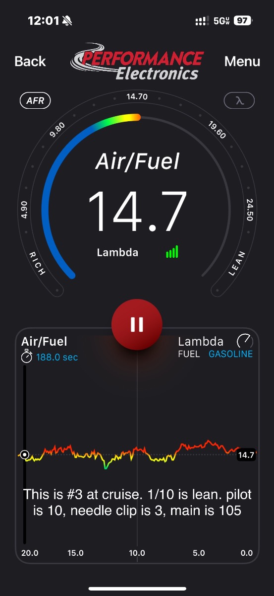 17 Nov 2025 16:20 - 17 Nov 2025 16:51It had 122.5 mains when i got it and a bunch of other jets that were way off. im now at about 105 mains. I uploaded the AFR curves (pictures) to chatgpt, told it where to look on the curve, and what afr i want. It took an afr of 9.4 to 13 in a single step. I could have jumped 3 jet sizes at a time, a couple of times, but im impressed by the time i was saved using AI. AI told me exactly what jets to put in each circuit, its just new and interesting.It seems you are over complicating this process. What are you going on about having AI analyze your curve for? Do you need AI to explain what circuit does what? You have limited choices to change in a carb and working with a stock motor + bolt ons shouldnt be a drastic change?