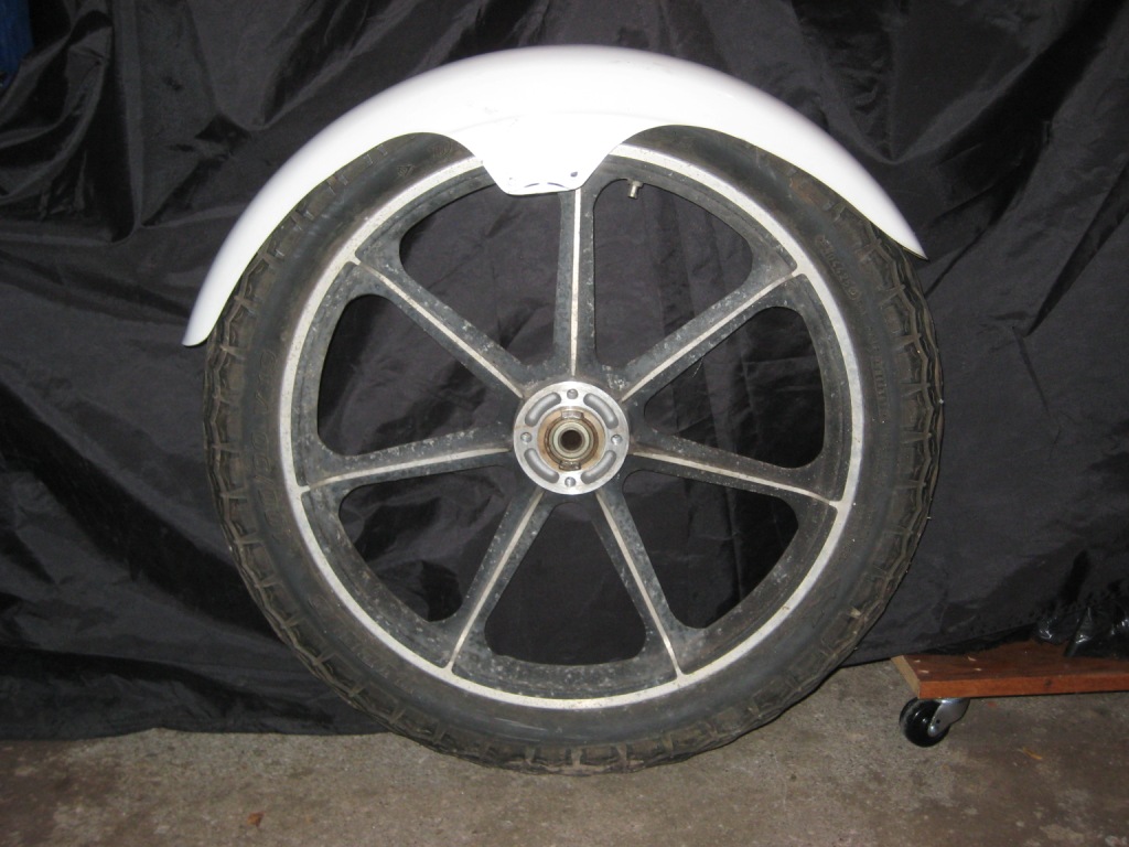 Here is the 19" glass front fender I bought at the swap meet for $10, sitting on a stock 650 C mag wheel.