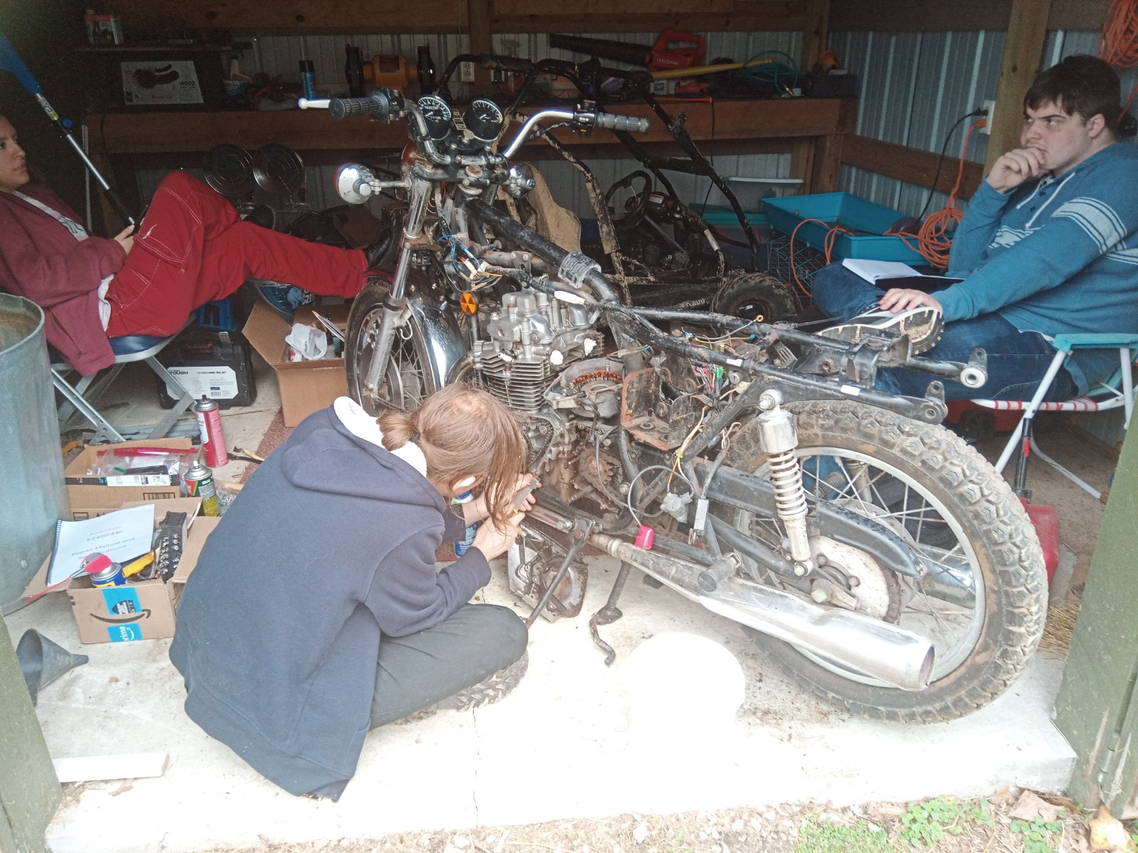 There was a charity marathon in the pickup in the pickup town so I had to navigate through a bunch of tight residential blocks whilst driving a Uhaul, the first truck I've driven (my daily is a subcompact so this was a pretty big shift). When we arrive we're met by the guy and his family, who are super kind and hang around while the guy walks us through the bike. To set the scene, I saw 4 or 5 motorcycles in that garage next to this pristine custom hot rod, and I can confidently assert that there was probably around 30-50k worth of bikes in there, absolutely gorgeous vintage and custom bikes (there was an ancient Harley that had been completely redone, a fully custom gorgeous CB400f, among others that I regrettably didn't get the chance to ask about). I do not think I've ever nerded out harder. As far as the KZ was concerned, we were walked through everything that was wrong. It's a pretty hefty project, but for everything that had to be done with the bike we were either told "and here's the brand new replacement for it," "I have something for that you can have," or "yeah I already fixed that." We walked out with the motorcycle and about 5 boxes of original and OEM replacement parts, full documentation (the guy gave us an ORIGINAL PARTS CATALOG, and two service manuals that he printed and BOUND, along with the full checklist of everything he was going to do to get the bike running again). While we were loading boxes I found the orignal toolkit and the pocket owner's manual that came with the bike in '76... I think those two alone were worth at least half of what we paid, from what I've seen. I've been looking for a good deal on that toolkit forever.
