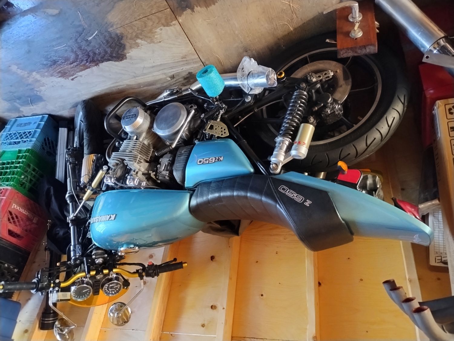 1978 KZ650 C2, 130K kms, Delkevic ex, EI, CVK32, PMC easy clutch, ATK fork brace, steering damper, braced swingarm, ZRX shocks, 18" Z1R front wheel.