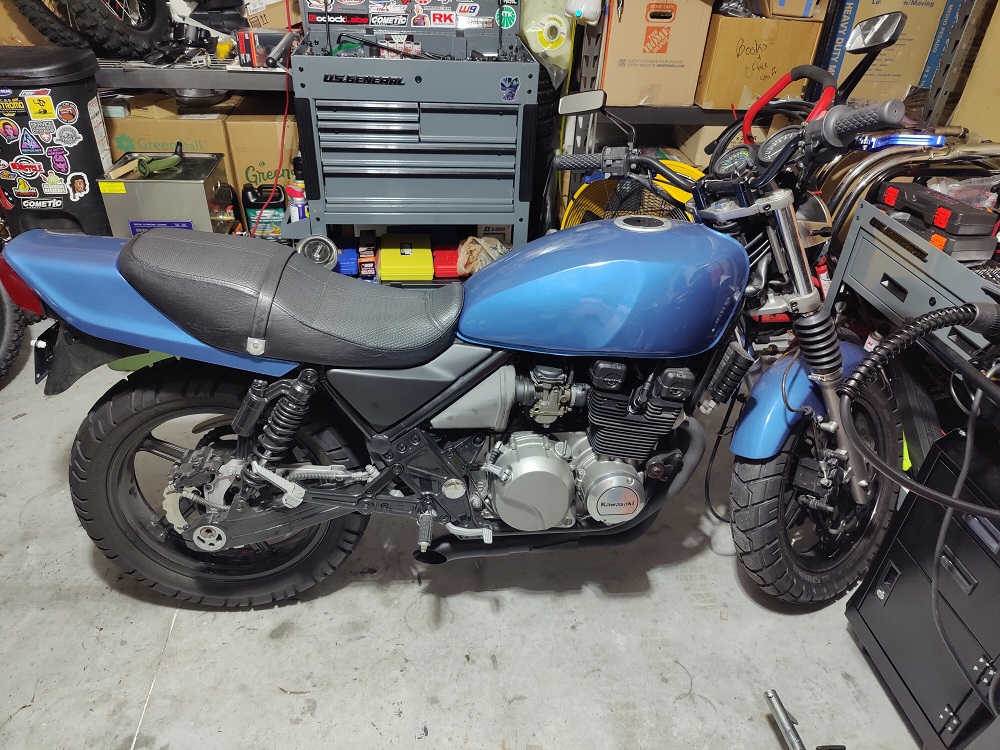 I picked this bike up back in August not even two weeks after buying a 750, the previous owner wanted to make a scrambler so it has oversized tires and some other questionable modifications(blue gauge lights). I got it cheap because it does not run(two cylinders), supposedly the timing is off. It smokes a ton of oil if you do start it. It does have a lot of powder coated parts that look nice, the paint is not original. I am going to bring it back to the stock look.