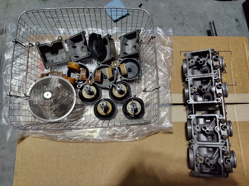 Carbs torn down to individual throttle bodies, cleaned and rebuilt. Fuel rail o-rings were nasty.