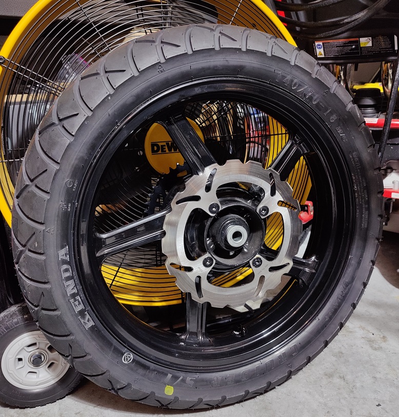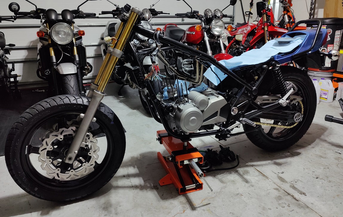 The used cylinder head I bought has several leaky valves, I set it off to the side. New exhaust valve installed into the old head, reassembled and put back on the bike. Valve clearance was loose, intakes all over 0.32mm and exhaust all at 0.50mm or more. The cam chain is at the edge of the service limit. New front(it had a 17t) and rear sprockets(39t was on it) installed, new rear tire to replace the oversized one on it. I removed the swingarm to check the bearings out, they're fine but there was very little grease and the seals are done. I am waiting on parts from Japan because surprise, you can't find them in the USA.