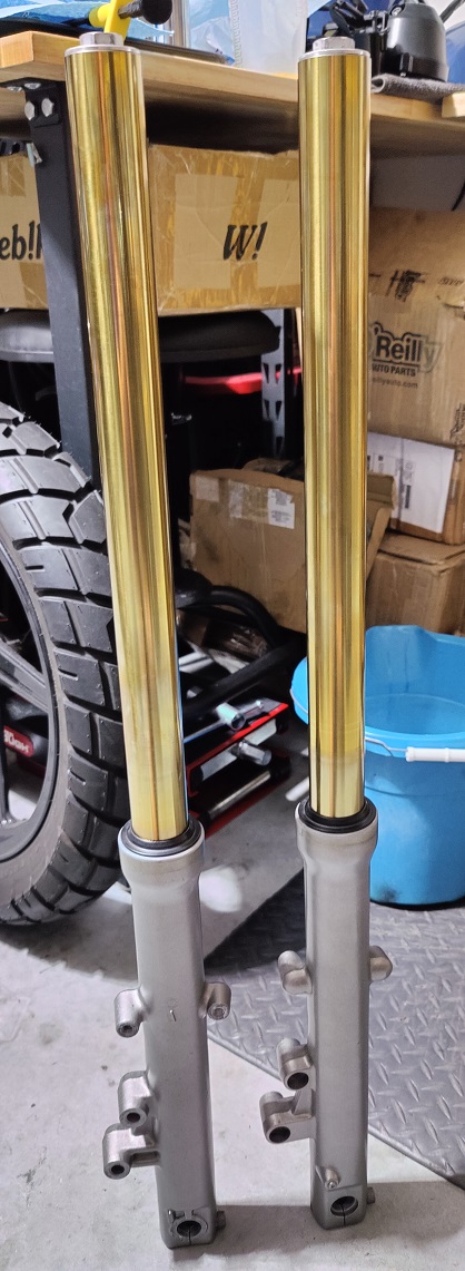 The project is still going but I may end up just getting rid of it as a roller once I get around to splitting the case. New fork tubes, previous owner crushed them in the clamps and the spring wouldn't move despite saying he rebuilt the forks(he just threw on new dust seals and they were out of oil). New OEM bushings and seals were also thrown on the forks. The lower steering bearing wasn't pressed on the stem completely, it's like he gave up trying to change it out after gouging the hell out of the steering stem trying to remove the race. I filed that down and got them changed out the correct way. Front tire(correct size) is new along with the wheel bearings. The only motorcycle I am buying after this would have to be a new one from a dealer, problem after problem just due to incompetence and being a lazy person on this bike.