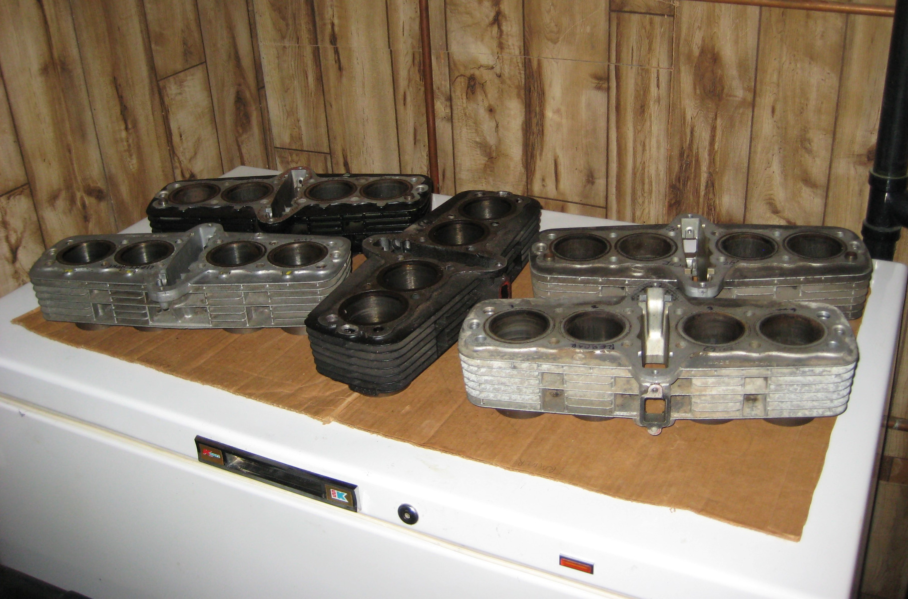 Since I had a set of low mileage 66 mm higher compression stock pistons left over I have been on the lookout for a cheap 1980 KZ750E barrel. After 4 years of waiting I found and bought a good condition cheap barrel today. Below is a pic of the later and earlier barrels.