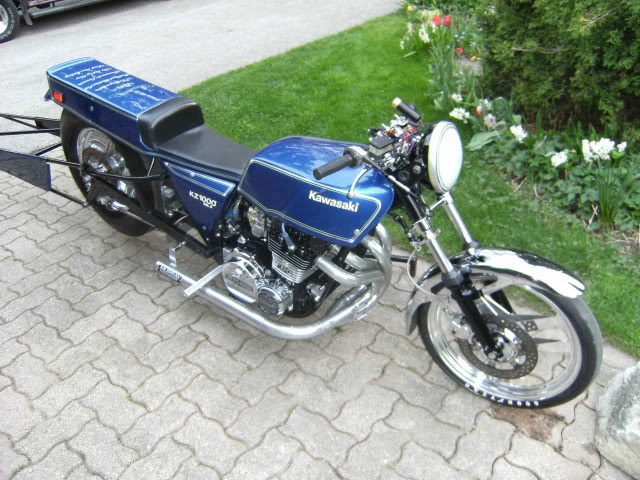 Green KZ was running 9's in 1/4. Had a big-block high comp. motor. The other is a Suzuki (yea I know) but just liked the picture. Sideways and smoking the tire...awesome.