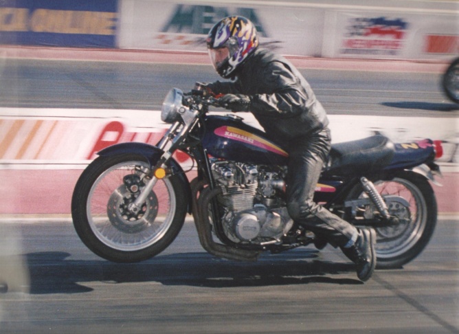 Green KZ was running 9's in 1/4. Had a big-block high comp. motor. The other is a Suzuki (yea I know) but just liked the picture. Sideways and smoking the tire...awesome.